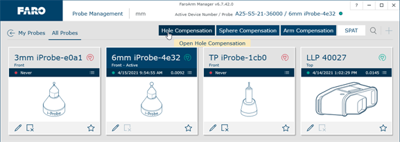 Ensure that High Accuracy Mode is disabled during compensation. See FARO Laser Line Probe Settings.