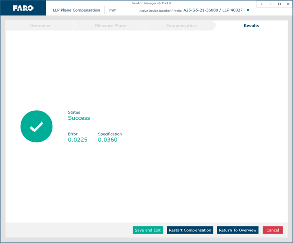 The digitized compensation points then calculate and the Compensation Status updates. If the probe passes, the current date and time is added to the probe information. Click Save and Exit to complete the compensation.