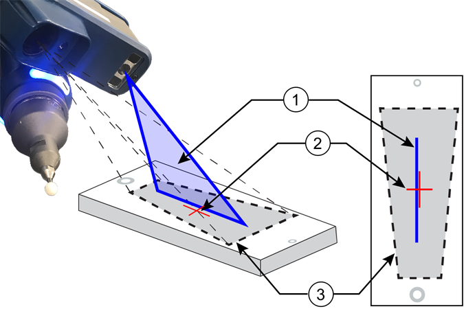 ① BlueLaser Line Beam ② Red Range Cross Hair ③ Camera Field of View (FOV) |