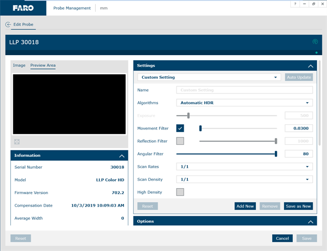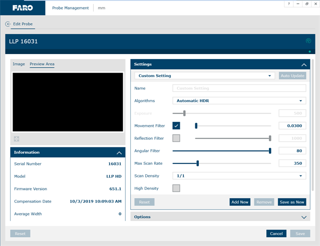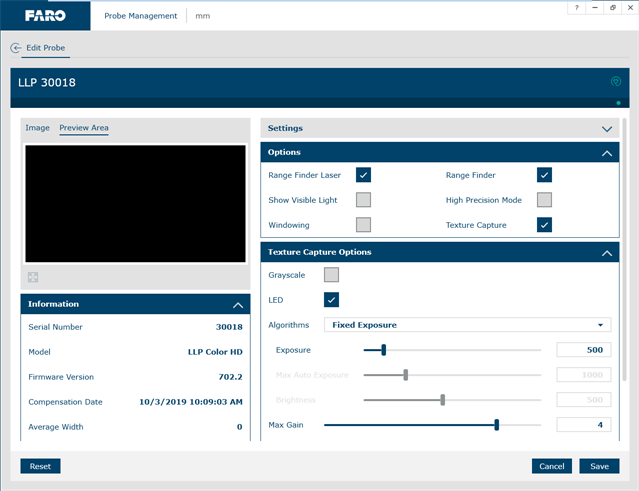FARO Laser Line Probe Settings