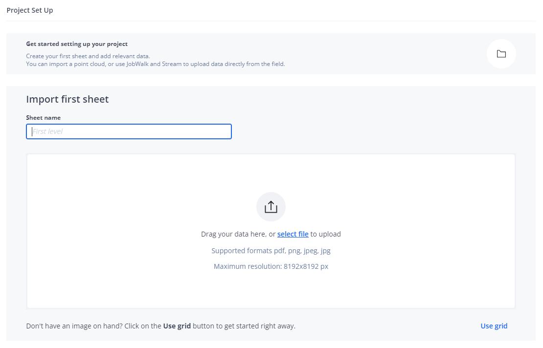 Click the Sheet tile to start uploading a new area. You are redirected to the Project Set Up page.