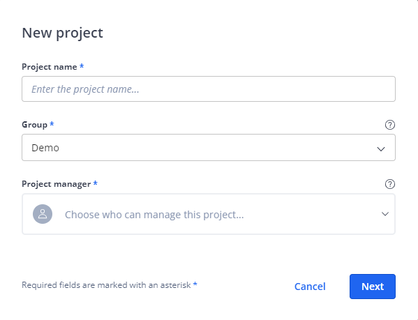 You can either enter an email address or select a user or team from the dropdown list. The Project Manager must be a member of the assigned group. For more information, refer to Project Manager Role.
