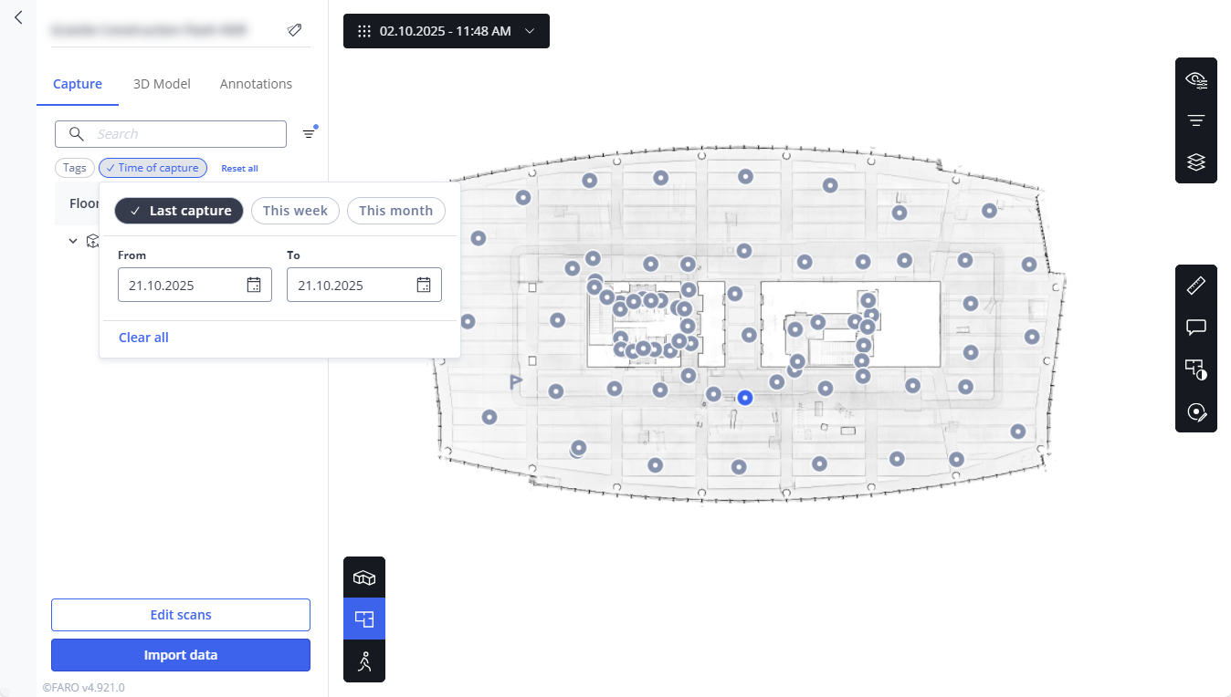 With the Time of capture filter, you can filter your project for a specific capture date. Capture date refers to all additions you make to a project, for example added scans, 360° photos or location markers.