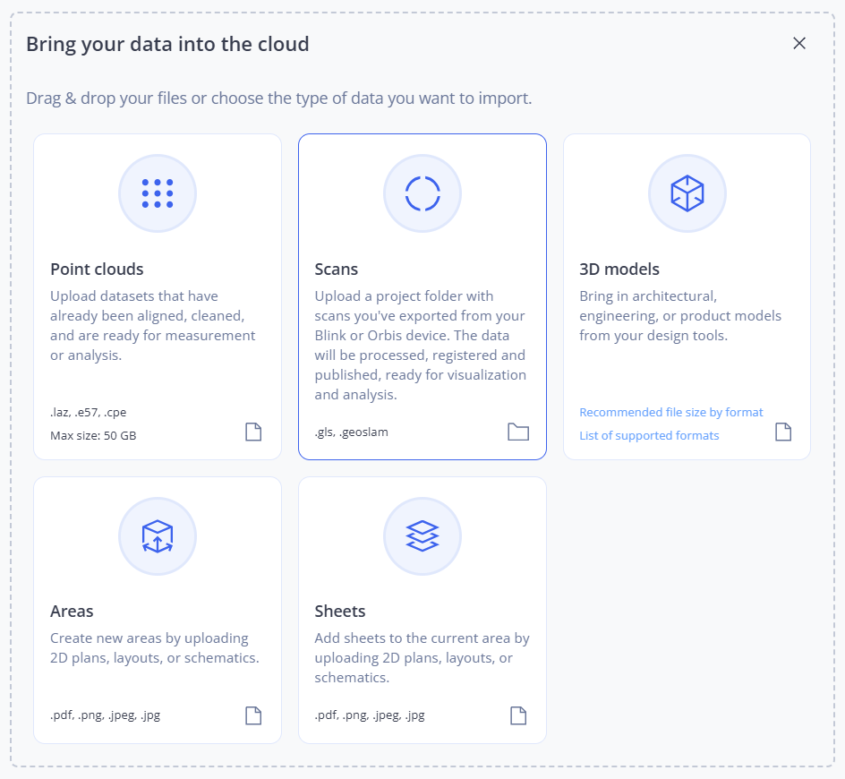 By default, you must upload a 2D plan, layout or schematic as an area to your project upon project creation. This will be the first area of your project. While working with the project, you can add further documents (.pdf, .png, .jpeg and .jpg format) to create more areas. For example, a capture of a building may have one area for each floor. If you upload a document as an area, the document, i.e. the sheet, on which the area is based will also be visible as a sheet within the area. See Import an Area into your Project for more information.