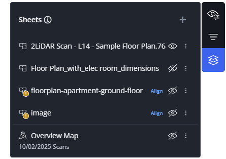 Note that these sheets are only visible in Sphere XG. They will not be visible in the JobWalk App or the HoloBuilder WebEditor. If you want sheets to be visible in the JobWalk App or in the HoloBuilder WebEditor, you can add them as areas in Sphere XG. For more information, see Import an Area into your Project.