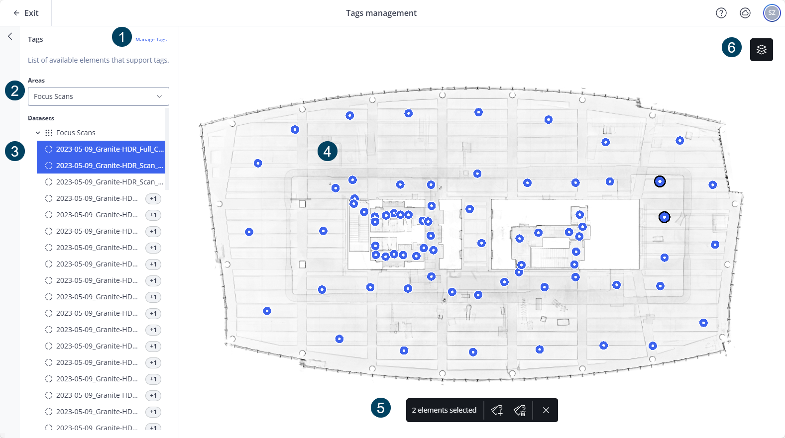You can assign tags to scans and waypoints (360° photos, 2D photos and location markers). This allows you to filter for these elements, see Filter for Tags for more information on filters.