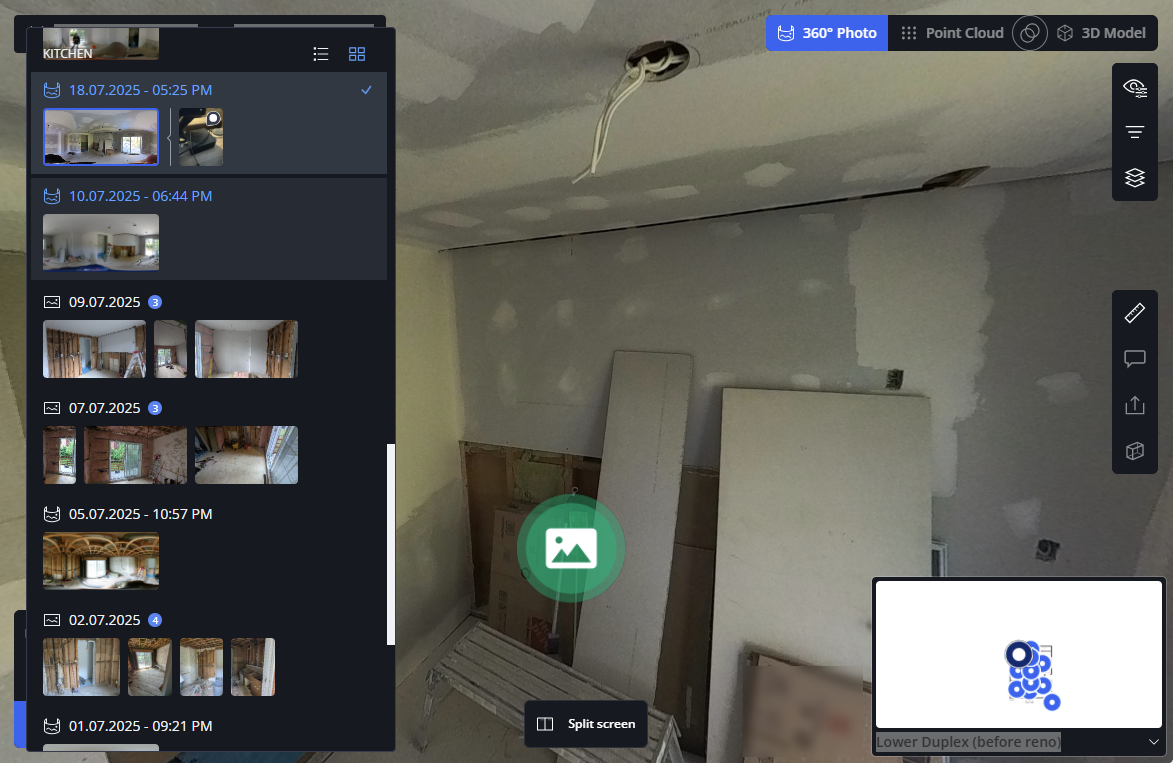 If you have uploaded photos at different points in time, you can create a so-called time travel that shows your project at various stages.