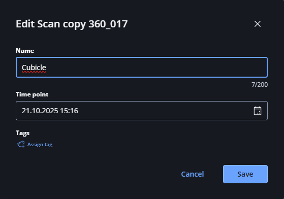 You can also enter the timepoint manually in the Time point field. The time point affects how the 360° photo will be grouped in the dropdown, see also Time-travel Through your Project.