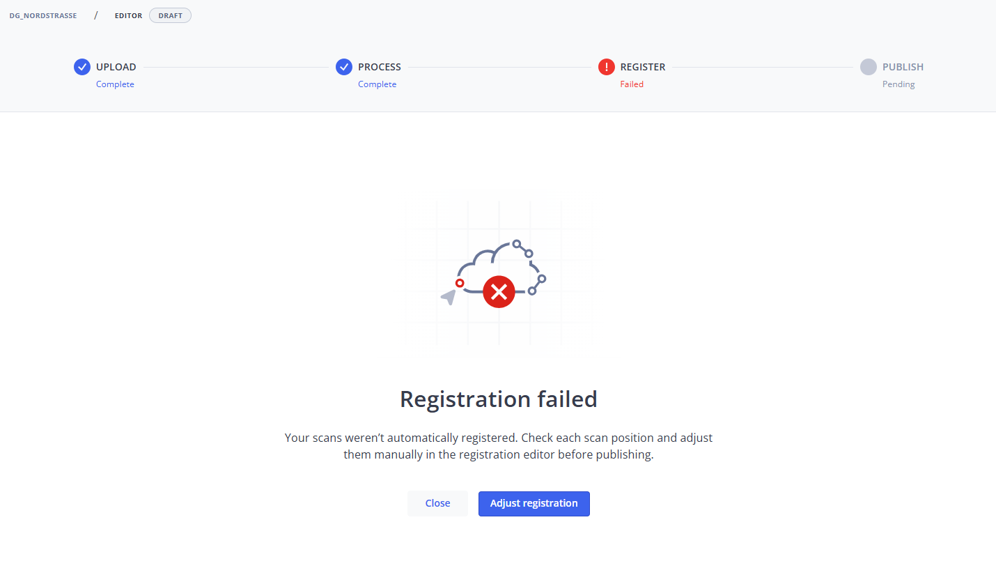 If uploading, processing and registering scans finishes with issues, this is usually due to a failure in registration, i.e. one or more scans could not be connected. You will be notified by an error message in Sphere XG and via email.