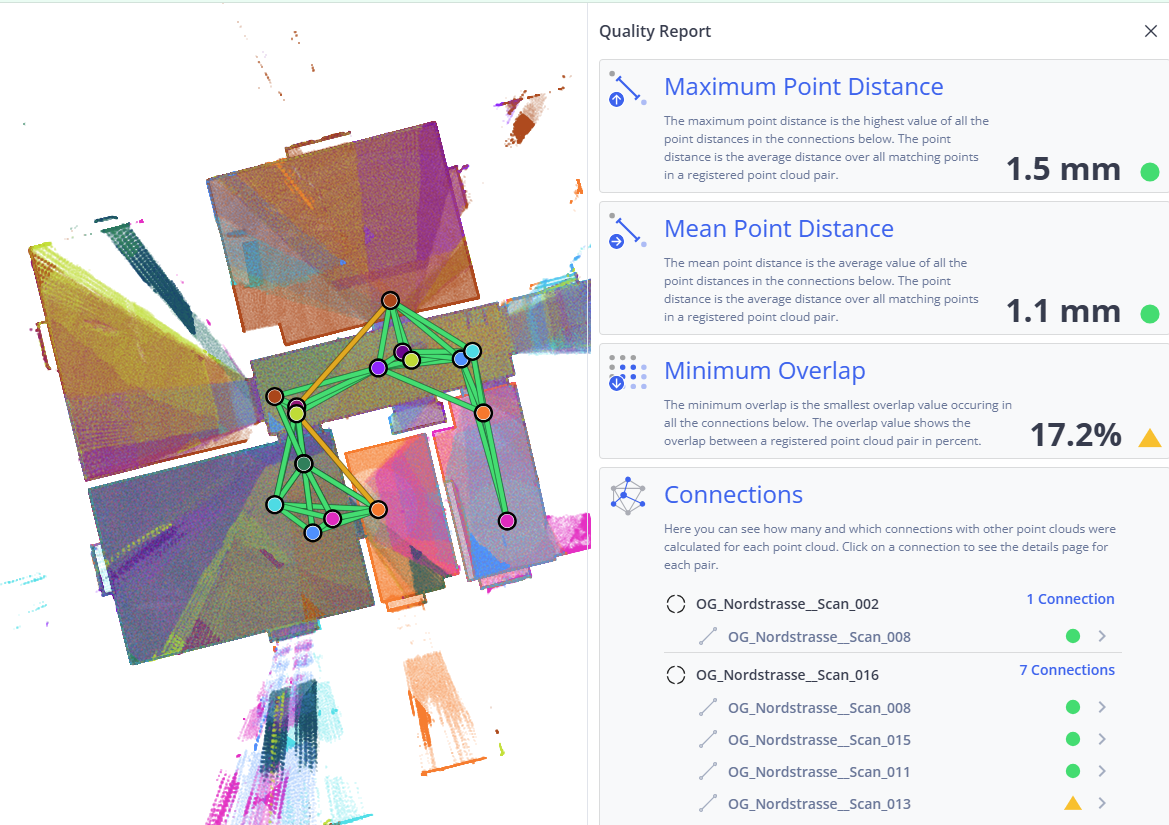 The quality report is opened. See explanations directly on the quality report page for further information. Hovering the mouse pointer over a connection highlights the connection and the connected scans.
