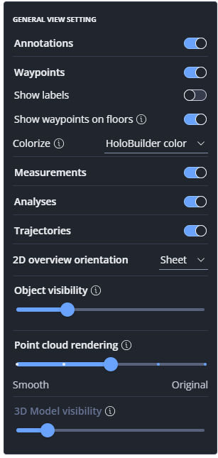 Show or hide information of the objects mentioned below. This is helpful in point clouds with a lot of objects to increase the visibility of a particular object type.