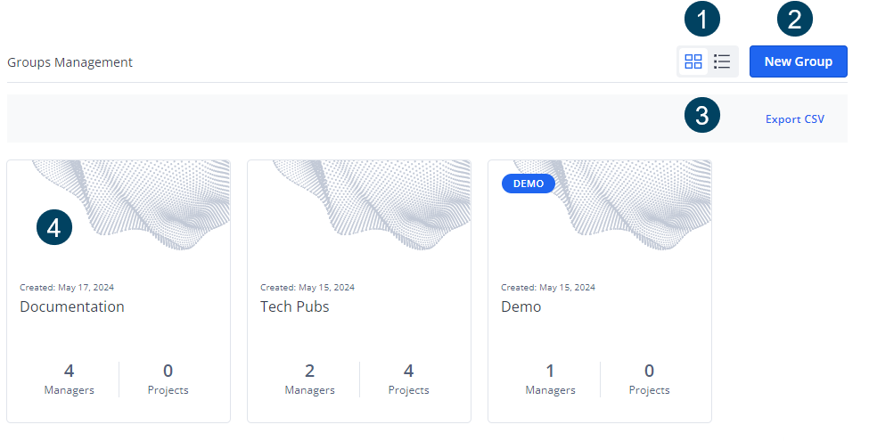 Group tile: Clicking the tile opens a page with the tabs Managers and Projects.