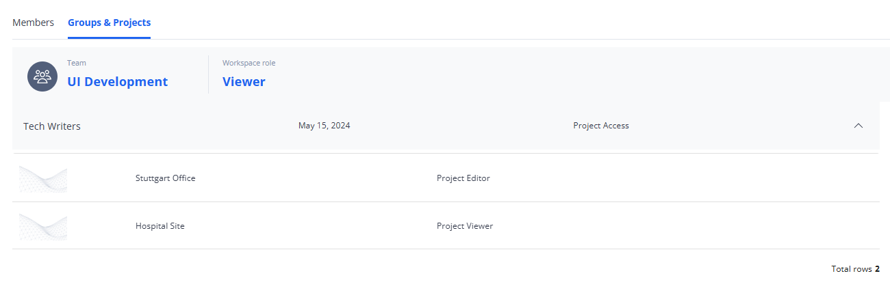The figure above shows that the team UI Development is a member of group Tech Writers and has access to the projects Stuttgart Office with the project role Project Editor and Hospital Site with the project role Project Viewer. The team does have project access but no role in the group managing the project (Group Manager or Project Manager).