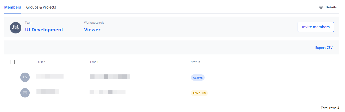 The list of (team) members shows the list of users who are members of the team with name and email address. Column Status shows whether users are active or pending, i.e. have not yet accepted the invitation to the team.