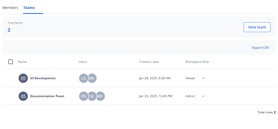 The (team) members summary shows the team name and the workspace role assigned to the team. Clicking on the name allows you to change the name. You assign the workspace role to the team at the team creation but you can also change it later on the Teams tab in column workspace.