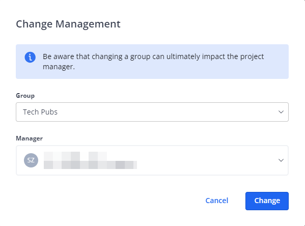 Changing one of these management assignments may also mean that you must change the other, because the Project Manager must be a member of the group to which the project is assigned.