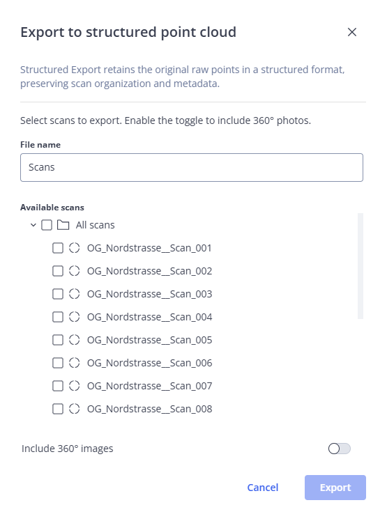 You can export selected scans or all scans of a point cloud to structured .e57 format. The export will retain the original raw scan points as well as the scan organization in clusters and scan meta data. You can also include 360° photos in the export.
